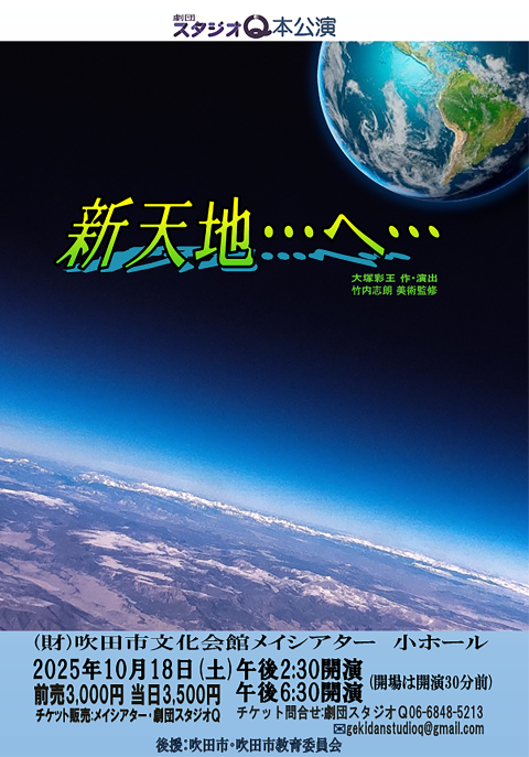 劇団スタジオQ本公演![]() 会 場:吹田市文化会館メイシアター 小ホール 日 時:10月18日(土) ①午後2時30分開演 ②午後6時30分開演 (開場は開演の30分前) チケット:前売 3000円 当日 3500円 |
